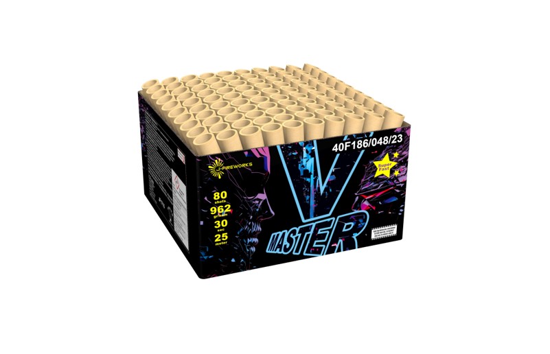Opskyder 80 store bomber I et V form (ud til siderne) I flere forskellige farver, kombineret med store haler og sølvspinner der springer i midten af V bomberne.